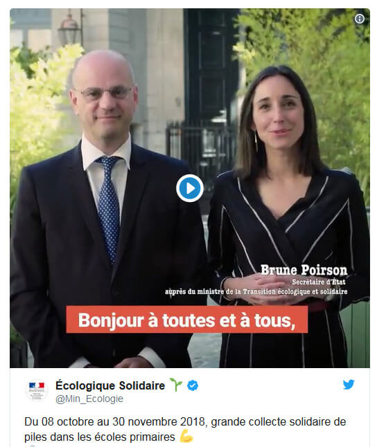 Du 08 octobre au 30 novembre 2018, grande collecte solidaire de piles dans les écoles primaires ?? @brunepoirson et @jmblanquer vous expliquent tout dans cette vidéo !Pour encore + d'infos, rendez-vous sur : https://t.co/1l3BjXvC8R ?cc @EducationFrance pic.twitter.com/Ge9mRV1Bow — Ministère de l’Écologie (@Ecologie_Gouv) July 12, 2018 La filière de recyclage des piles organise une grande […]